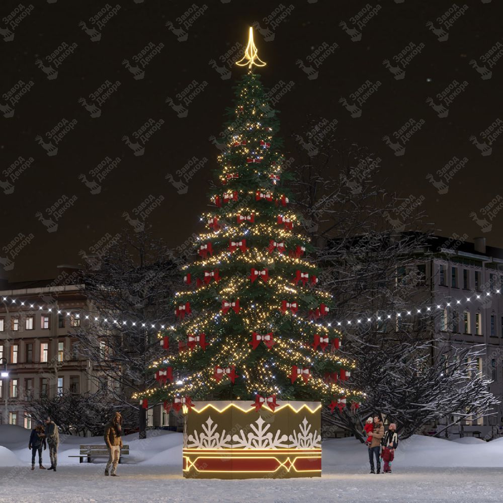 Уличная ствольная ёлка для украшения города на Новый год. Световая ель с готовым комплектом оформления станет прекрасным украшением в период зимних праздников. Ствольная новогодняя ёлка выполнена из прочного каркаса с хвоей. Ограждение выполнено из прочного алюминиевого каркаса с декоративной печатью. Сама уличная ёлка украшена светодиодными гирляндами и мотивами в виде бантов.
