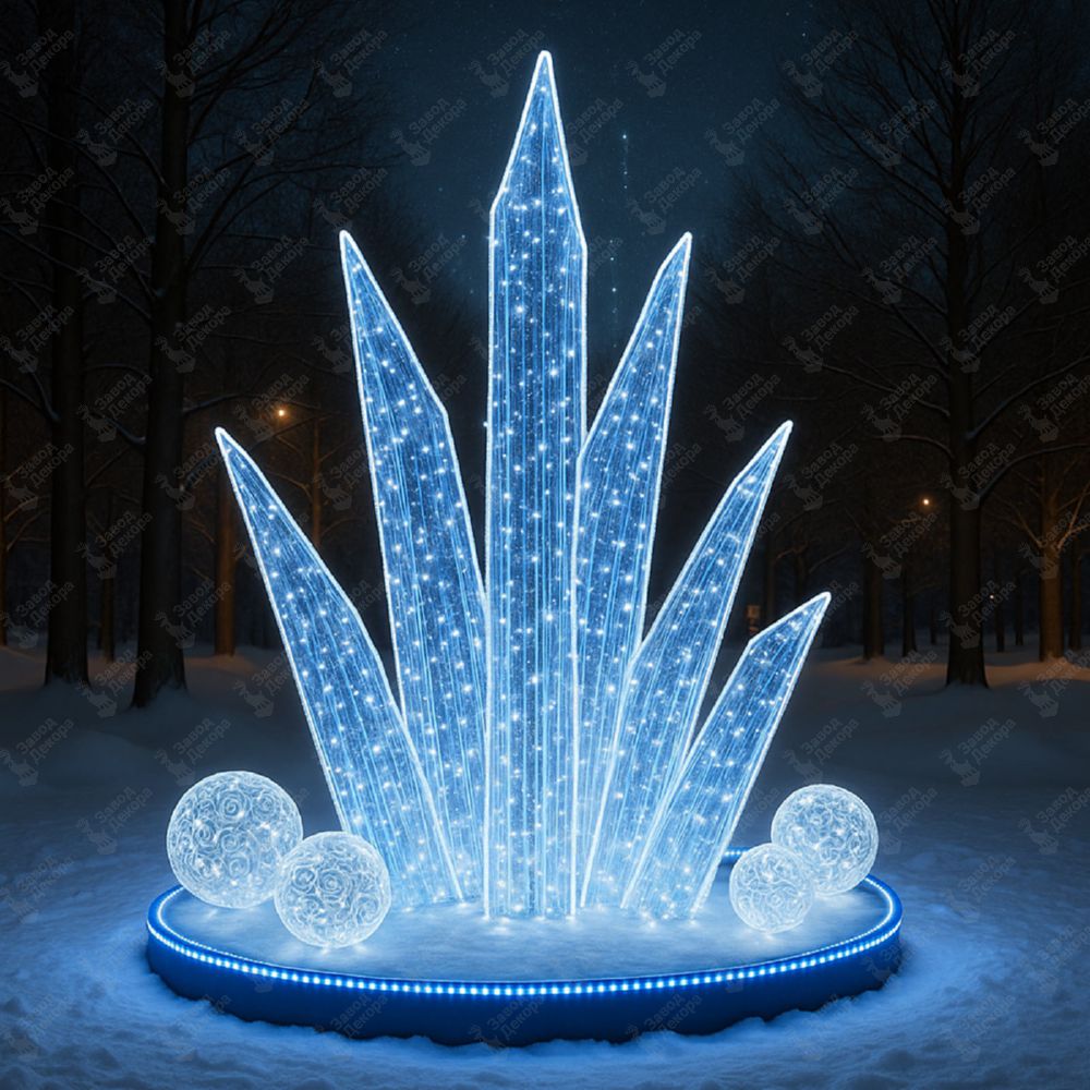 Дополняют композицию декоративные светящиеся шары, создающие контраст и усиливающие эффект глубины. Всё это установлено на круглой платформе с контурной подсветкой, что делает «Кристальные ледники» ярким арт-объектом и фотозоной в городской среде.