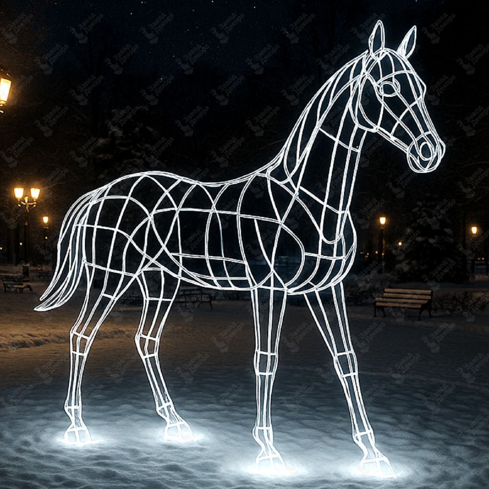 Фигура изготовлена из прочной стали с двухслойным полимерным покрытием. Контуры лошади обтянуты светодиодной нитью с холодным белым свечением и безопасным напряжением 24 вольта.