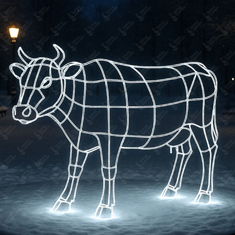 Световая фигура «Корова» — оригинальный арт-объект, выполненный в минималистичном геометрическом стиле. Чёткие линии каркаса и сияние светодиодной нити подчёркивают форму животного, создавая атмосферу уюта и волшебства.